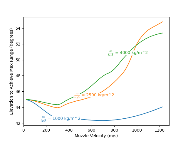 For projectiles at very low velocity, the drag experienced is very small, and consequently the optimal range trajectory is close to the vacuum solution, or launching at exactly 45 degrees. Then, as the effect of drag become significant with increasing velocity, which is more so for projectiles with a lower (adjusted) sectional density, the trajectory becomes increasingly asymmetric: the climb out to maximum range is much less steep than the descent to target, which incentivizes lower angles that better utilize this phase of flight.